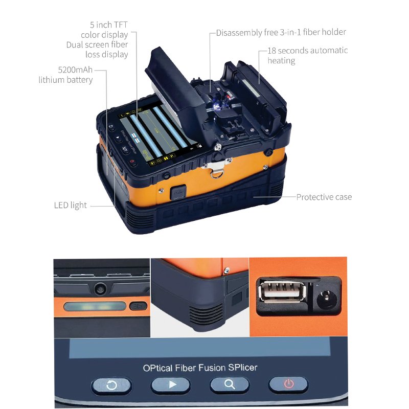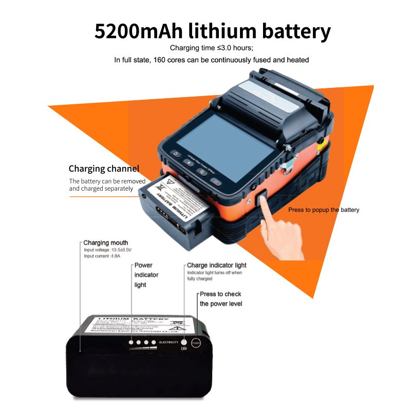 Signal Fire Al-5 is mainly suitable for security monitoring and other engineering projects. Adopting a 5-inch color screen, the operation graphics are simple and intuitive, Up to 320x focusing magnification, 8 second high-speed splicing, 18second heating, with a 50% increase in work efficiency compared to ordinary fusion machines; The 5200mAh lithium battery can fuse and heat about 160 cells when fully charged. Its unique lighting design makes it convenient for night construction emergency repairs.